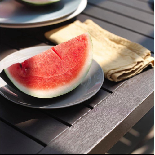 Stackable table 140X80 cm. Material: DurelTOP in polypropylene with UV additives and uniformly coloured. Legs in coated aluminum. Matt finish. Adjustable height feet. Recyclable resin.